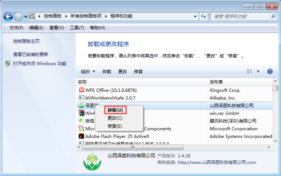 在【程序和功能】列表找到【澤醫(yī)藥】,右鍵【卸載】;